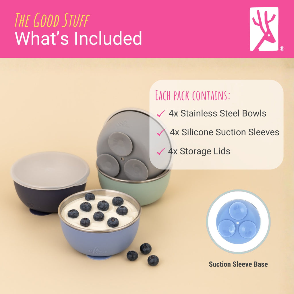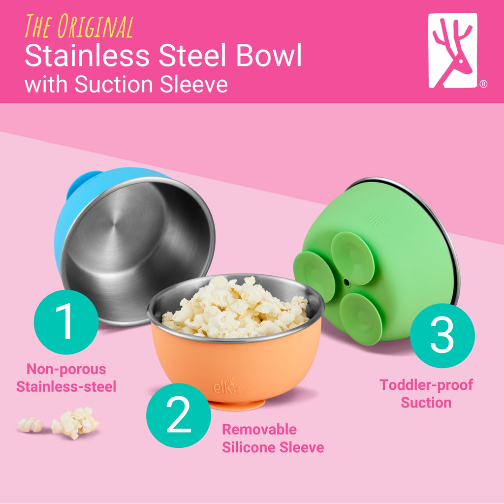 SUCTION BASE, LESS MESS: Removable silicone suction sleeve (patented) grips smooth surfaces to help keep bowls steady during mealtimes. Designed to support self-feeding and give little hands more control at the table. These sleeves have a suction base.